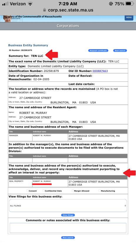 Murray is described in some documents as the "manager" of Ten LLC. He is also the manager, but not only the manager. He is the resident agent (person who receives all corporate communications), and "the person authorized to execute ... any recordable instrument". He also signed Ten LLC's annual report. Click here to search for corporate documents at the on the State Secretary's Corporation page.